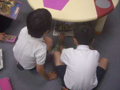 雨の日は図書室が大賑わい。それぞれが心落ち着く場所があるようで、本棚を背もたれにする子、床に座る子、机の下に本を置いて読む子、友だちとくっついて読む子・・・