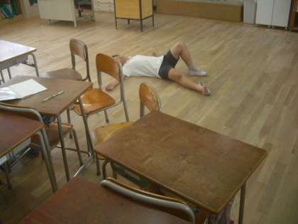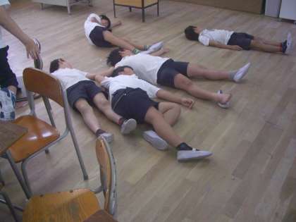 昼休みに、各学年の教室をのぞくと、男の子が床に大の字で寝ている教室がありました。