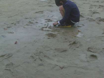 小さな水たまりが残る運動場で、ひとり泥遊びを楽しんでいます。