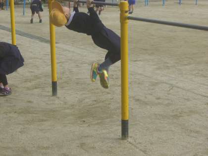 逆上がりを根気強く練習する男の子。