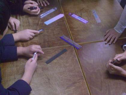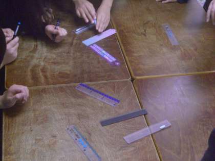 定規の端をペンで押えて、ひっくり返して下に落とす遊びを定規バトルと言うらしいです。「ジョギバト」「ジョギバト」と言って遊ぶ4年生。