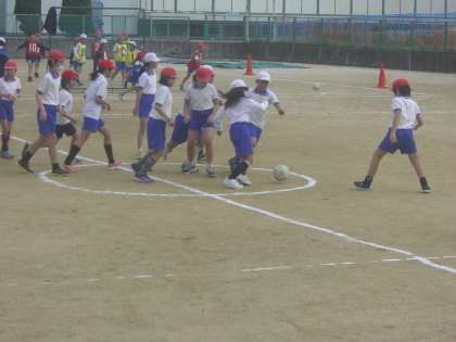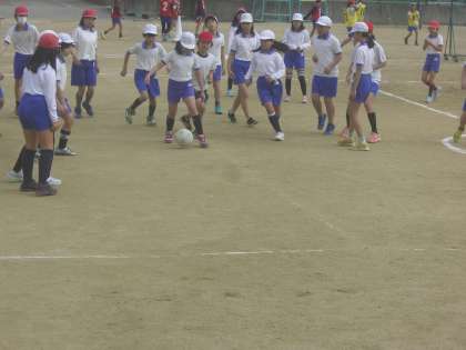ボールに群がるサッカー。みんな一つのボールを必死で追いかけています。