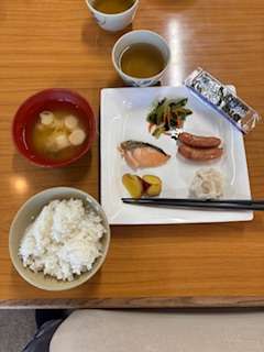 6時起床、朝の集いを終えて、朝食をいただいています。今日は午前中登山なので、しっかりと朝ごはんを食べて頑張ります。