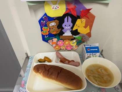 大阪市の給食では、仕切りのある皿に主食と主菜、副菜を盛り付けるため、左側に皿を置き、右側に椀を置くことになります。