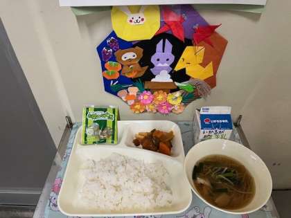 給食では、豚肉とたまねぎ、たけのこ、にんじん、ピーマンを使用し、米酢、こいくちしょうゆ、ケチャップなどで味付けをしています。