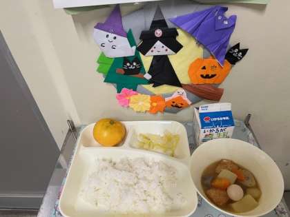 今日の給食では鶏肉、うずら卵、ごぼう平天、じゃがいも、こんにゃく、あつあげ、だいこん、にんじんを使用しています。