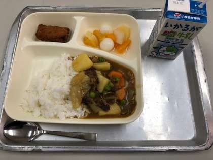 今日は入学お祝い献立「カツカレーライス・フルーツ白玉・牛乳」です。