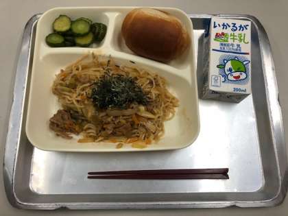 今日の献立は、「焼きそば・きゅうりのしょうがづけ・黒糖パン・牛乳」です。給食は、みなさんの心も体も健康に成長することができるように、栄養のバランスがとれた食事になっています。