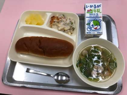 今日の給食は、「マカロニグラタン・レタスのスープ・りんご(カット缶)・黒糖パン・牛乳」です。今日のグラタンは、マカロニ、牛乳、粉末チーズを使用しています。