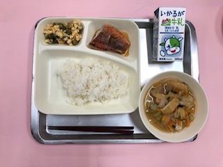 今日の献立は、「赤魚のしょうゆだれかけ・みそ汁・えんどうの卵とじ・ごはん・牛乳」でした。