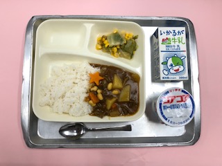 今日の献立は、「牛肉と大豆のカレーライス、レタスとコーンのサラダ・ヨーグルト・牛乳」でした。