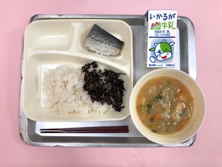昨日の給食は、「さごしの塩焼き・みそ汁・牛ひじきそぼろ・ごはん・牛乳」でした。