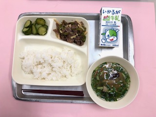 今日の給食は「チンジャオニューロウスー・ハムと野菜の中華スープ・きゅうりの辛味付け・ごはん・牛乳」でした。