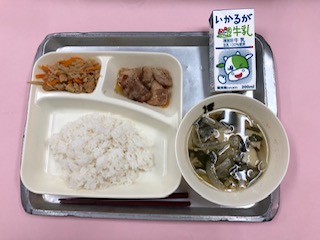 6月14日の給食は、「鶏肉のしょうゆバター焼き・五目汁・切り干し大根の炒め煮・ごはん・牛乳」でした。
