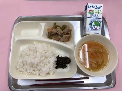 今日の給食は、「豚肉のごまみそ焼き・すまし汁・のりのつくだ煮・ごはん、牛乳」です。