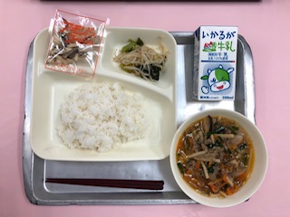 今日の給食は、「マーボーはるさめ、チンゲンサイともやしの甘酢あえ、アーモンドフィッシュ、ごはん、牛乳」でした。