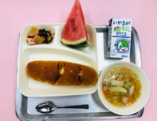 今日の給食は、「鶏肉と夏野菜のソテー、押麦のスープ、すいか、おさつパン、牛乳」です。