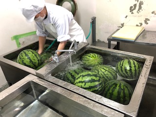 3枚目の写真は、調理員さんがすいかを洗っているところです。
