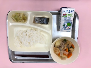今日の給食は「ごはん、さごしの塩焼き、じゃがいもと一口がんもの煮もの、キャベツのおひたし、牛乳」です。