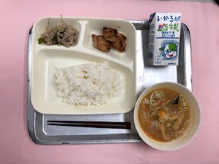 今日の給食は「鶏肉の照り焼き、みそ汁、野菜いため、ごはん、牛乳」です。