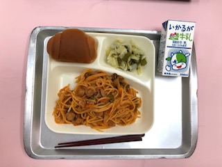 今日の給食は、「黒糖パン(小)、イタリアンスパゲッティ、グリーンアスパラガスとキャベツのサラダ、牛乳」です。