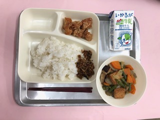 今日の給食は、「ごはん、鶏肉のたつたあげ、あつあげと野菜の煮もの、おかかなっ葉、牛乳」です。
