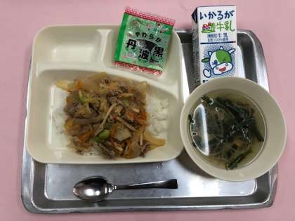 今日の給食は、「ピリ辛丼、中華スープ、ソフト黒豆、牛乳」です。