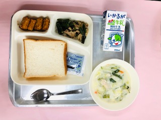 今日の給食は「食パン、ブルーベリージャム、白菜のクリーム煮、あつあげのごまじょうゆかけ、豚肉と三度豆のオイスターソースいため、牛乳」です。