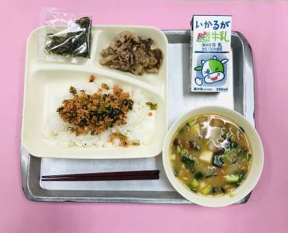 今日の給食は「さけとこまつなのごはん、豚肉とれんこんの甘辛焼き、冬野菜のみそ汁、牛乳」です。