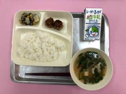 今日の給食は「ごはん、あげシューマイ、とうふのスープ、ツナとチンゲンサイのいためもの、牛乳」です。