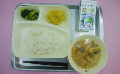 今日の献立は「ごはん、かす汁、ブロッコリーのしょうがづけ、くりきんとん、牛乳」です。