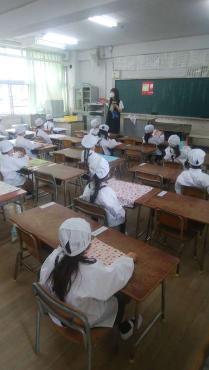写真は、1年生の給食準備の様子です。すこし緊張しながらも、一生懸命活動していました。