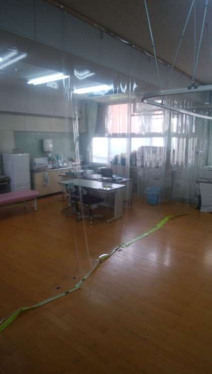 また、保健室では発熱や体調不良になった児童と保健室にきた児童の接触を防ぐために、透明の仕切りを管理作業員さん協力のもと設置しています。