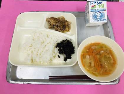 今日の給食は「ごはん、豚肉のごま味噌焼き、すまし汁、のりの佃煮、牛乳」です。