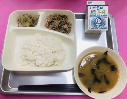 今日の給食は「ごはん、豚肉と野菜のいためもの、みそ汁、キャベツの赤じそあえ、牛乳」です。