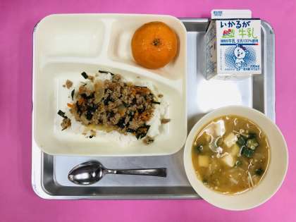 今日の給食は「豚ミンチとニラのそぼろ丼、オクラのみそ汁、冷凍みかん、牛乳」です。
