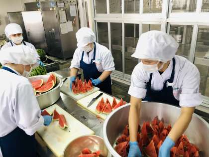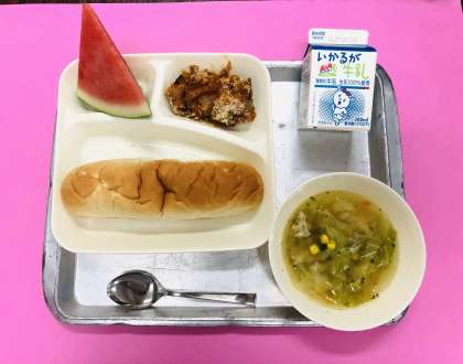 今日の献立は「おさつパン、かぼちゃのミートグラタン、スープ、すいか、牛乳」です。