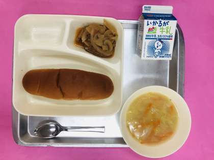 今日の給食は「黒糖パン、煮込みハンバーグ、コーンスープ、牛乳」です。