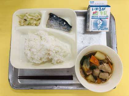 今日は給食は「ごはん、さごしの塩焼き、豚肉とじゃがいもの煮もの、キャベツの梅風味、牛乳」です。
