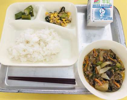 今日の給食は「ごはん、マーボーなす、オクラの甘酢あえ、ツナとチンゲンサイのいためもの、牛乳」です。