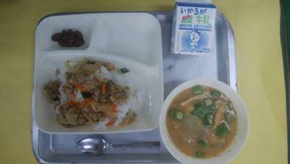 今日の給食は「他人丼、冬瓜のみそ汁、金時豆の煮物、牛乳」です。
