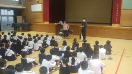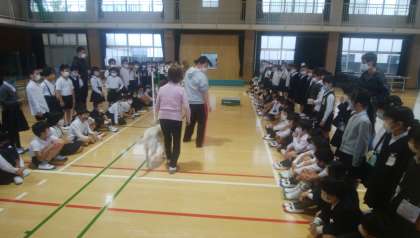 最初にDVDで盲導犬についてわかりやすく説明していただいたあと、盲導犬の実際の動きを目の前で見せていただきました。こどもたちにとってはとても貴重な体験になったことと思います。