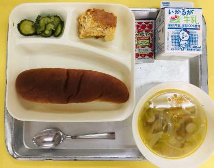 今日の給食は「黒糖パン、ツナポテトオムレツ、スープ、きゅうりのバジル風味サラダ、牛乳」です。