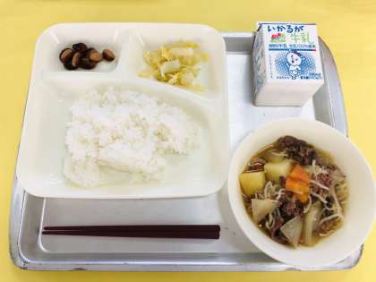 今日の給食は「ごはん、肉じゃが、はくさいのゆず風味、とら豆の煮もの、牛乳」です。