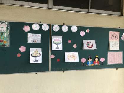給食室前の掲示もひなまつりになっています。学校に来られる機会があれば、ぜひみてくださいね。