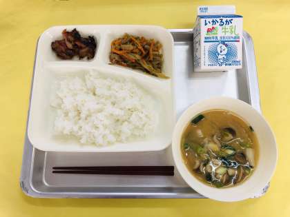 今日の給食は「ごはん、鶏肉の照り焼き、さつまいものみそ汁、きんぴらごぼう、牛乳」です。