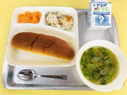 今日の給食は「パンプキンパン、マカロニグラタン、レタスのスープ、みかん(缶詰)、牛乳」です。