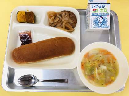 今日の給食は「コッペパン、いちごジャム、煮込みハンバーグ、コーンスープ、焼きかぼちゃ、牛乳」です。