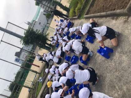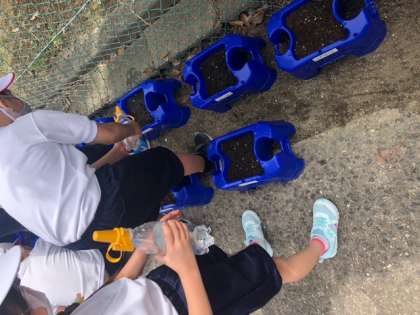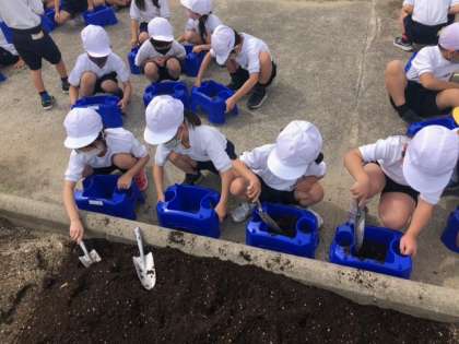 学習園に行き、鉢植えに土を入れました。肥料を混ぜて、土に4本穴をあけ、種を一粒ずついれました。