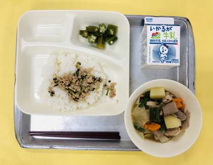 今日の献立は「ごはん、豚肉とじゃがいもの煮物、オクラの梅風味、ツナっ葉いため、牛乳」です。